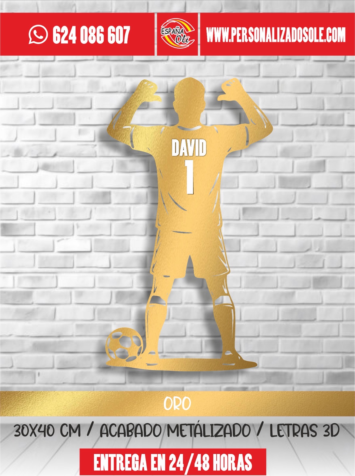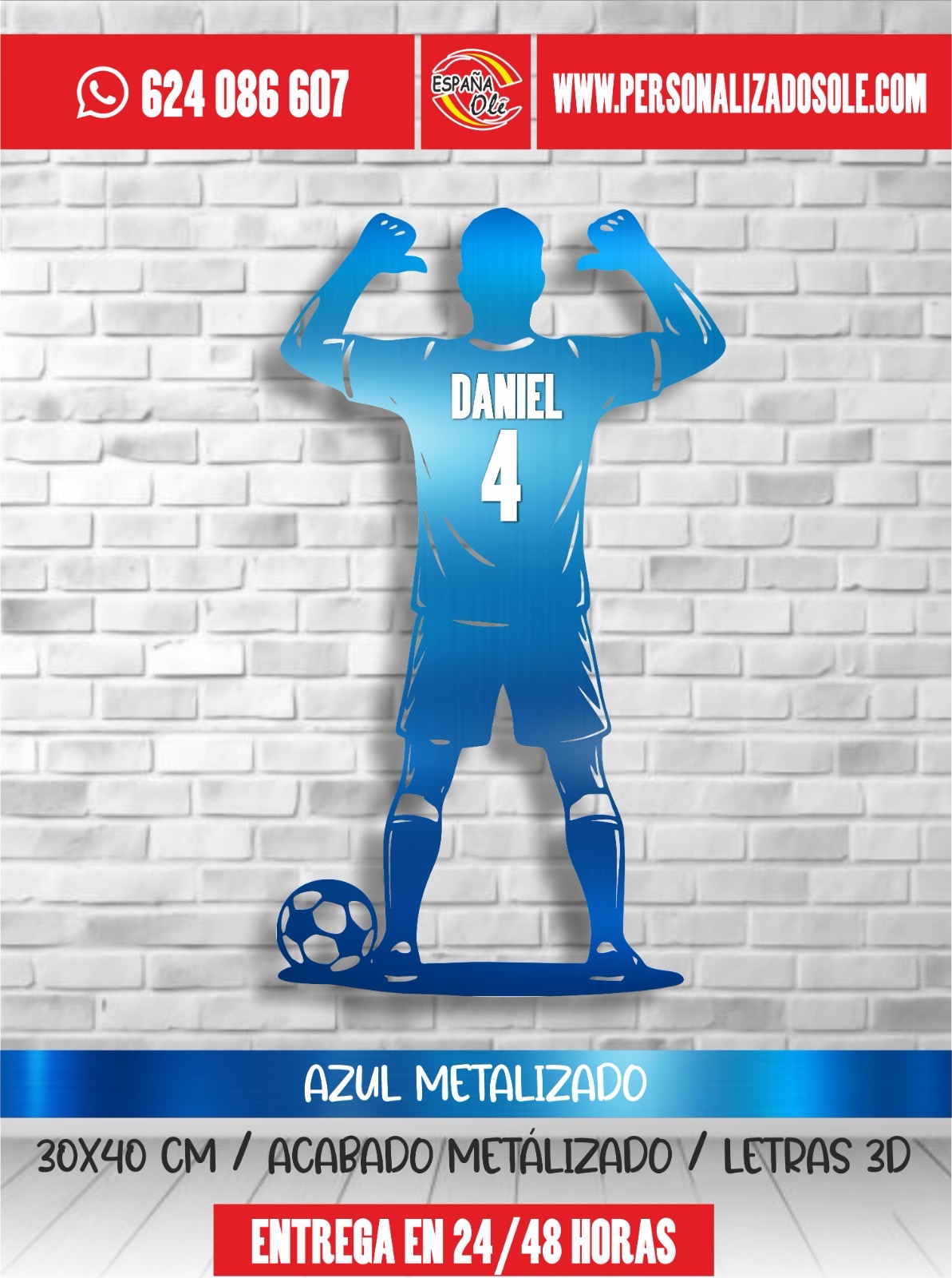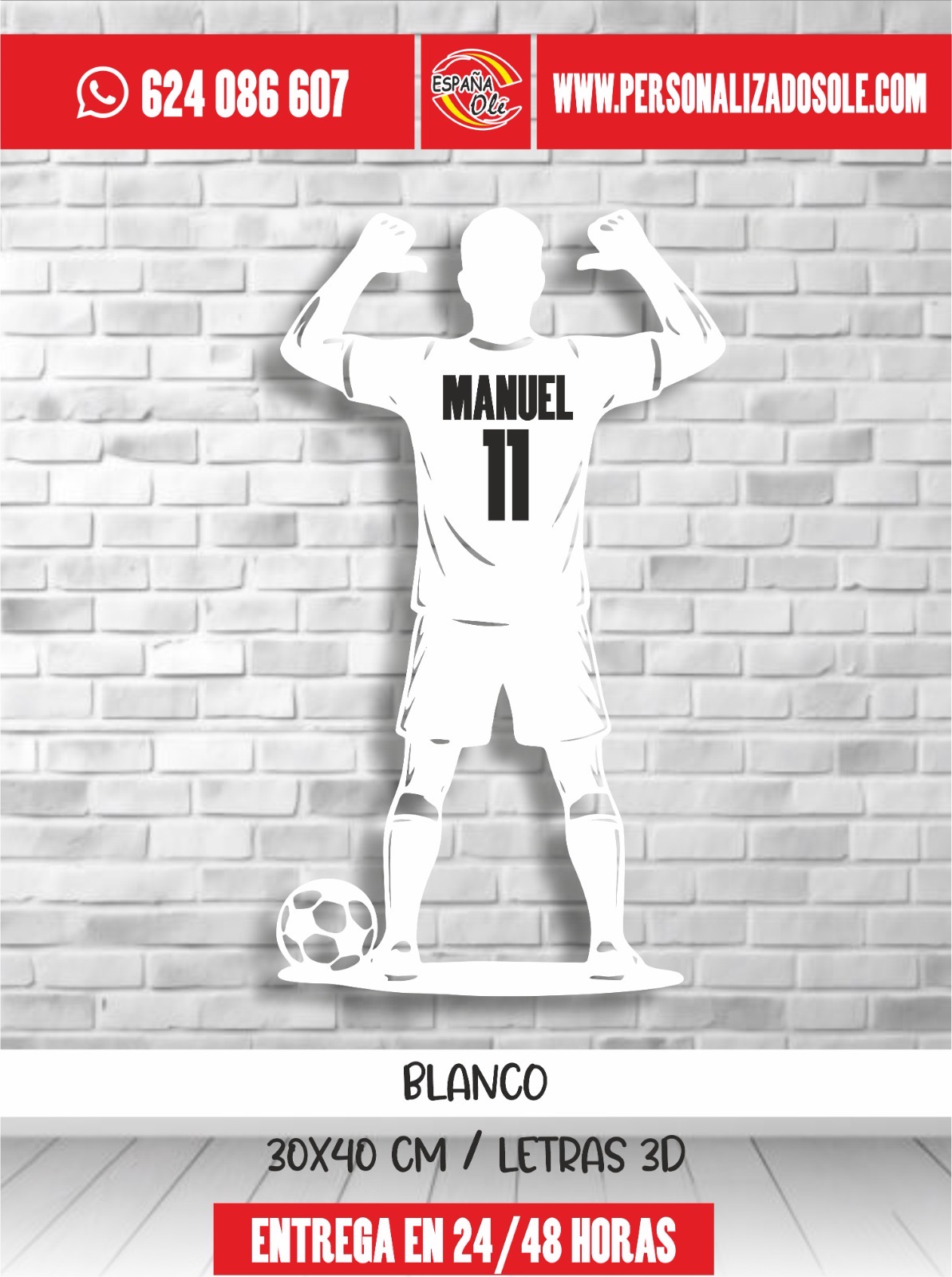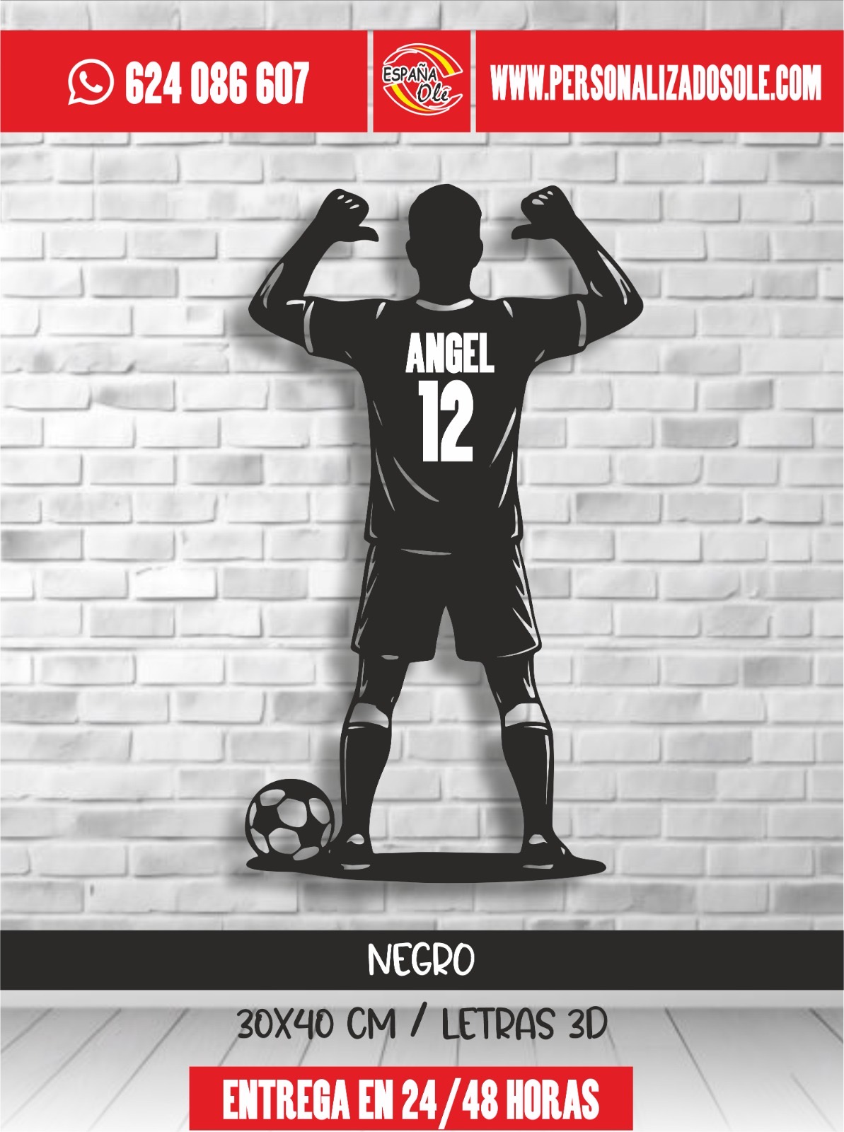 Silueta decorativa de jugador de fútbol personalizada con nombre y número. Fabricada en material resistente y con diseño moderno, es ideal para decorar habitaciones, espacios deportivos o regalar a los amantes del fútbol. Un detalle único que convierte cualquier pared en un homenaje personalizado.