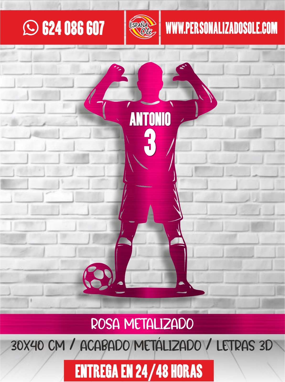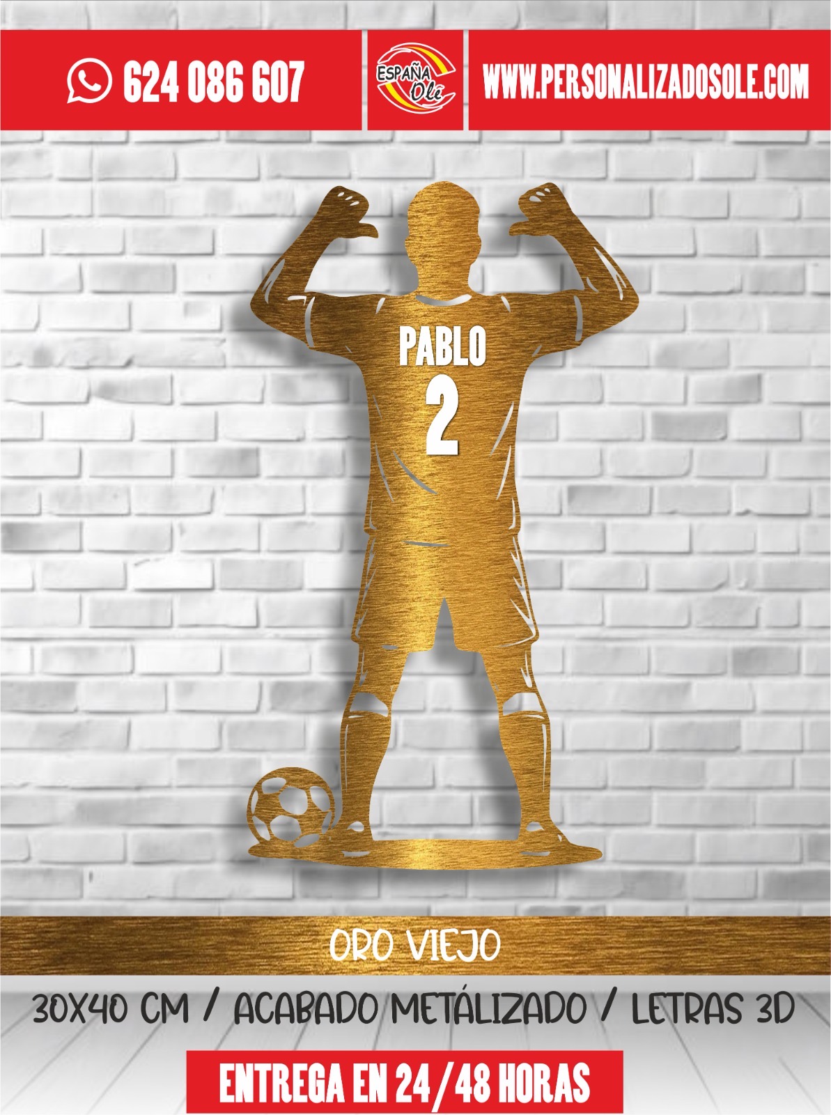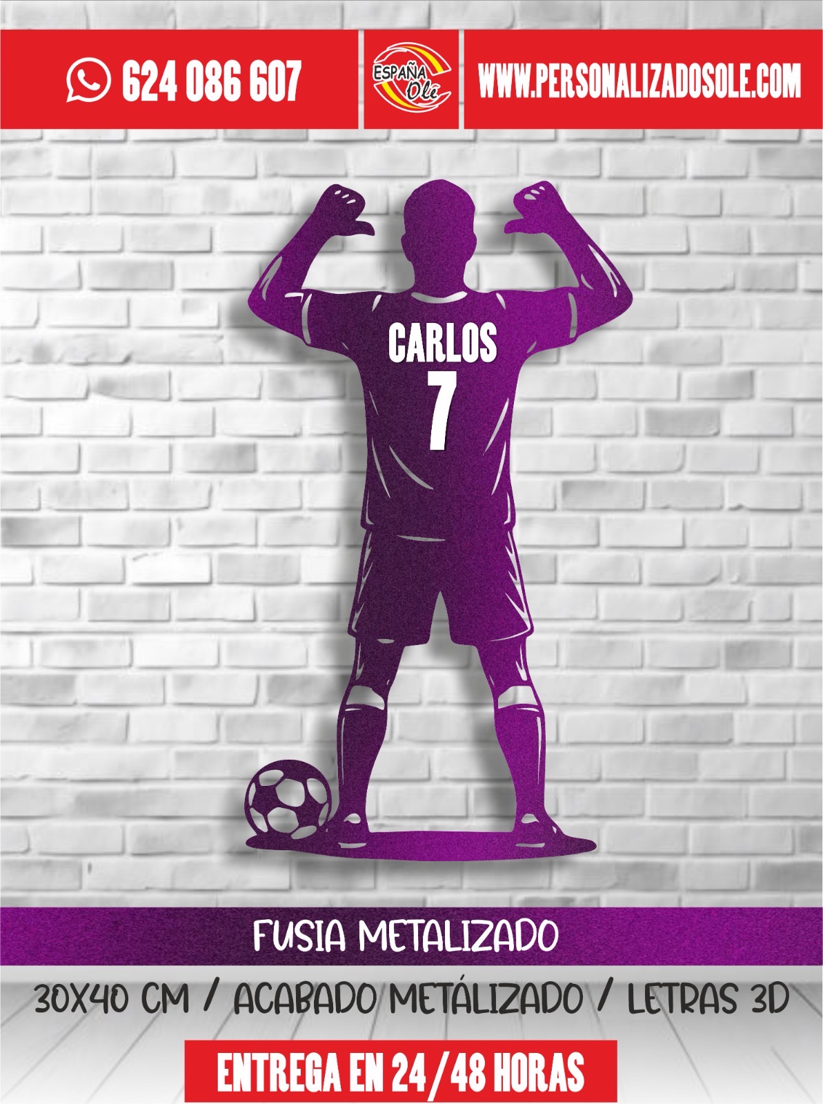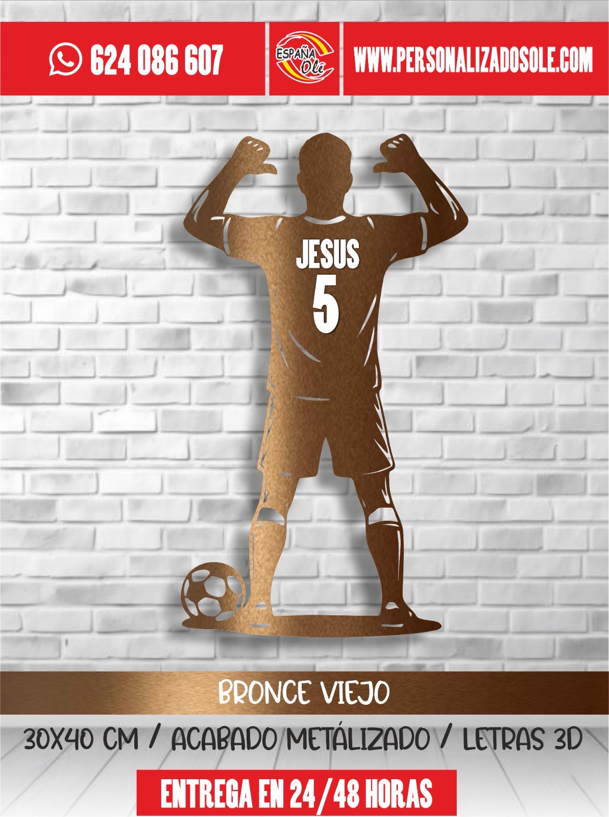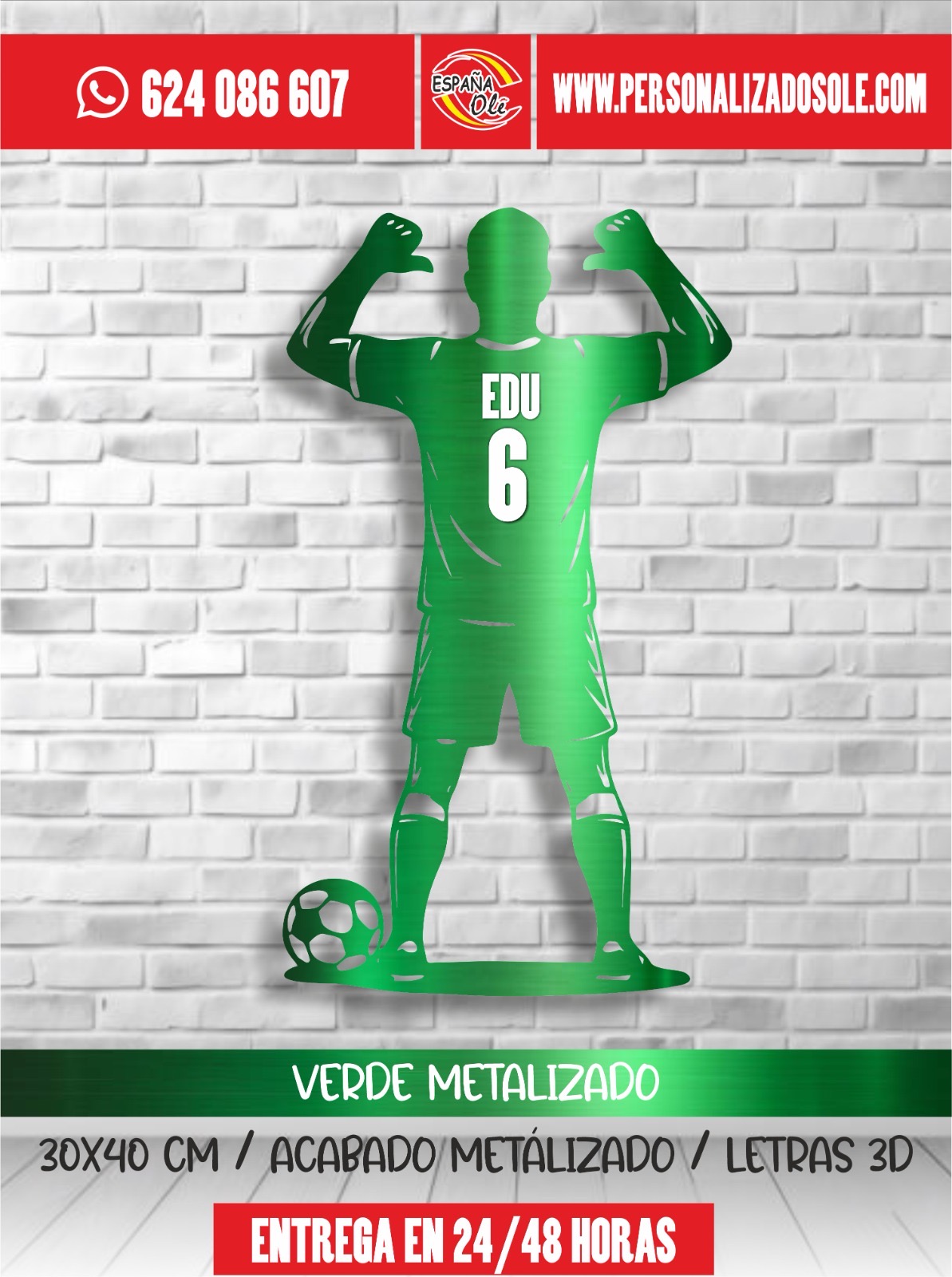 Silueta decorativa de jugador de fútbol personalizada con nombre y número. Fabricada en material resistente y con diseño moderno, es ideal para decorar habitaciones, espacios deportivos o regalar a los amantes del fútbol. Un detalle único que convierte cualquier pared en un homenaje personalizado.